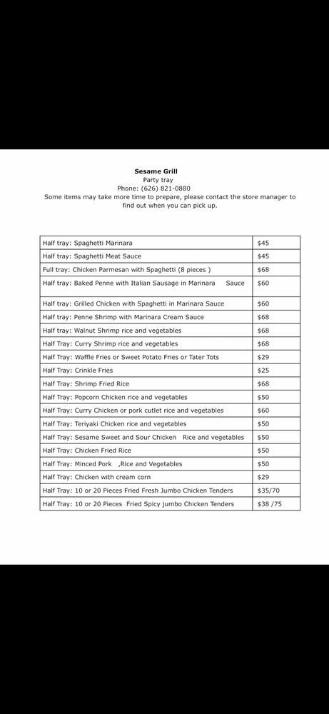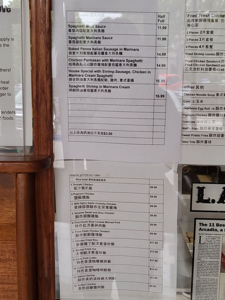 Sesame Grill in Arcadia, CA, is a hidden gem offering a diverse menu in a cozy setting. With options like fried chicken sandwiches, popcorn chicken, and spicy chicken strips, it caters to various tastes. The generous portions and quality of food impress customers, especially those who love spicy flavors. The newly added items like Waffle Fries and Fried Chicken Sandwich are standouts, with crispy textures and flavorful meats. The friendly service and accommodating staff enhance the dining experience. Don't miss the chance to try their delectable pasta dishes and refreshing mango shakes. Whether for a quick bite or a special event, Sesame Grill's excellent food, service, and ambiance make it a top choice in the area.